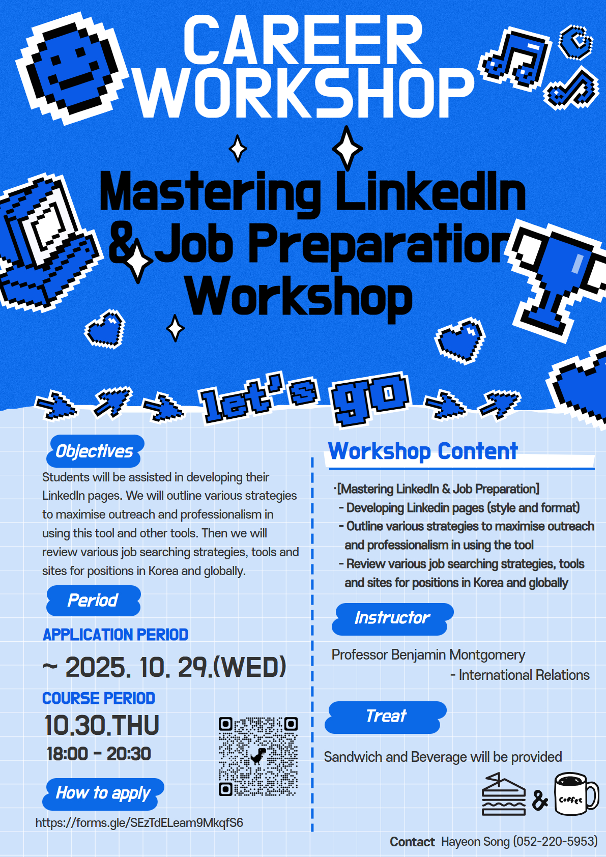 - Developing Linkedin pages (style and format) - Outline various strategies to maximise outreach and professionalism in using the tool - Review various job searching strategies, tools and sites for positions in Korea and globally [Contact] Song Hayeon(052-220-5953, mjjsongg@ulsan.ac.kr) ------------------------------------------------------------------------------------------------------------------------------------ 울산대학교 국제교류팀에서 외국인 유학생을 위한 취업역량강화 프로그램인 Mastering LinkedIn & Job Preparation Workshop 를 시행하고자 합니다. 해당 대면 워크숍은 해외취업을 희망하는 해외 기업 취업에 맞춘 취업역량 강화 워크숍입니다. 신청를 위하여 신청자의 정확한 정보를 기입하여 주시기 바랍니다.
